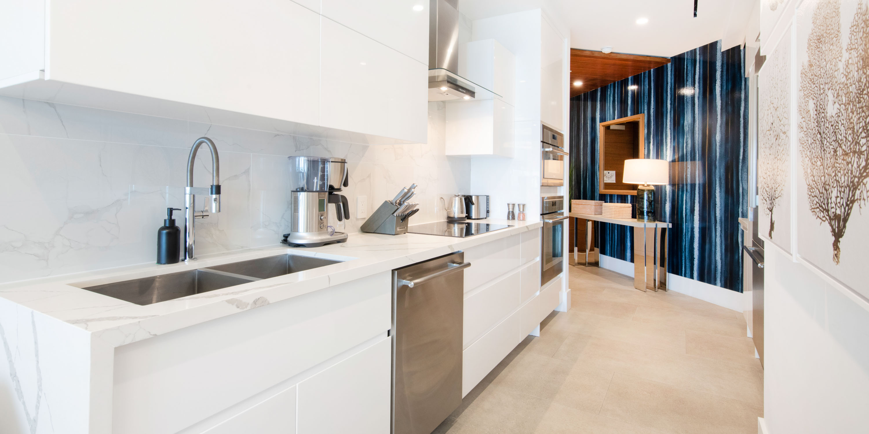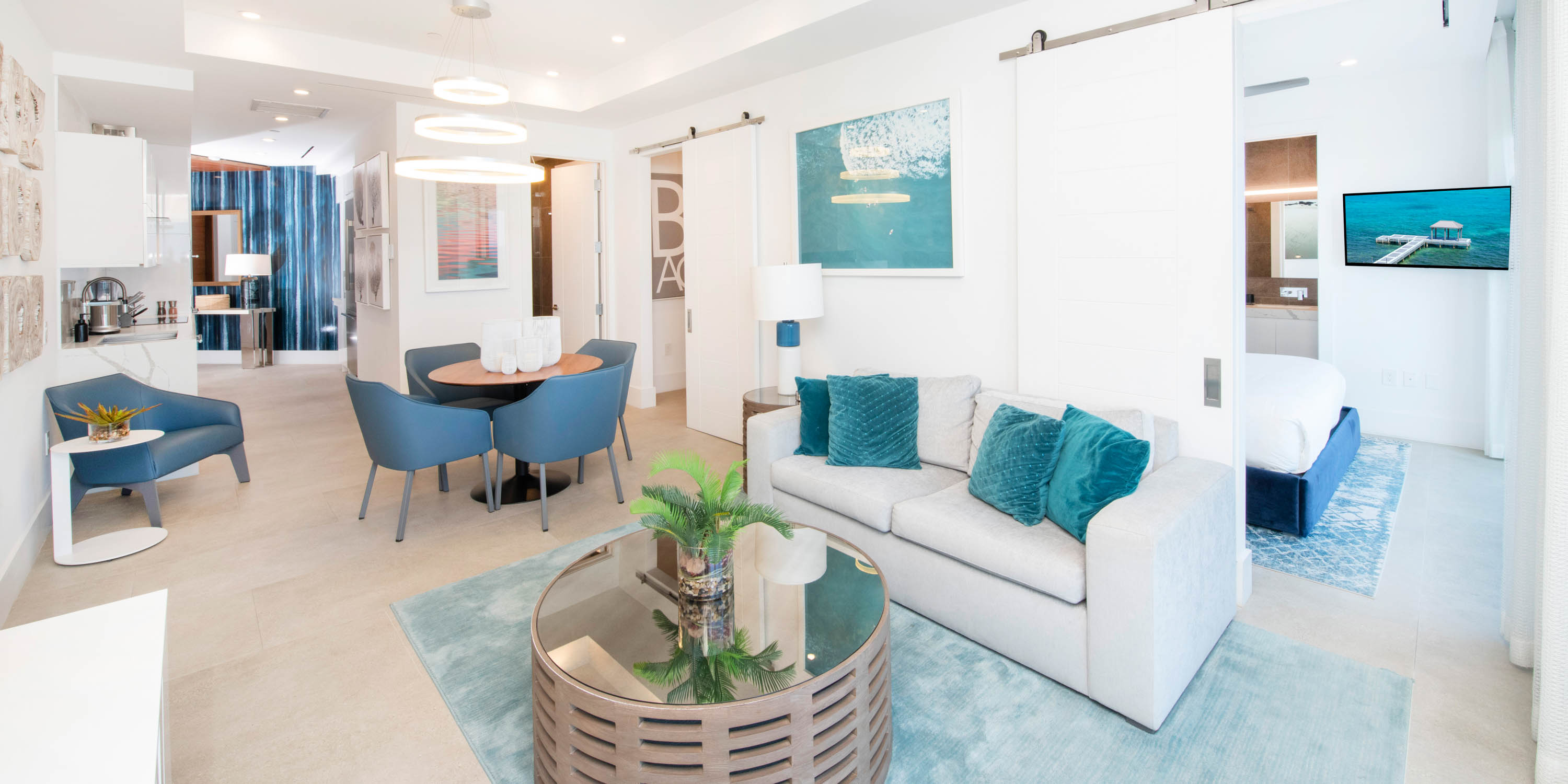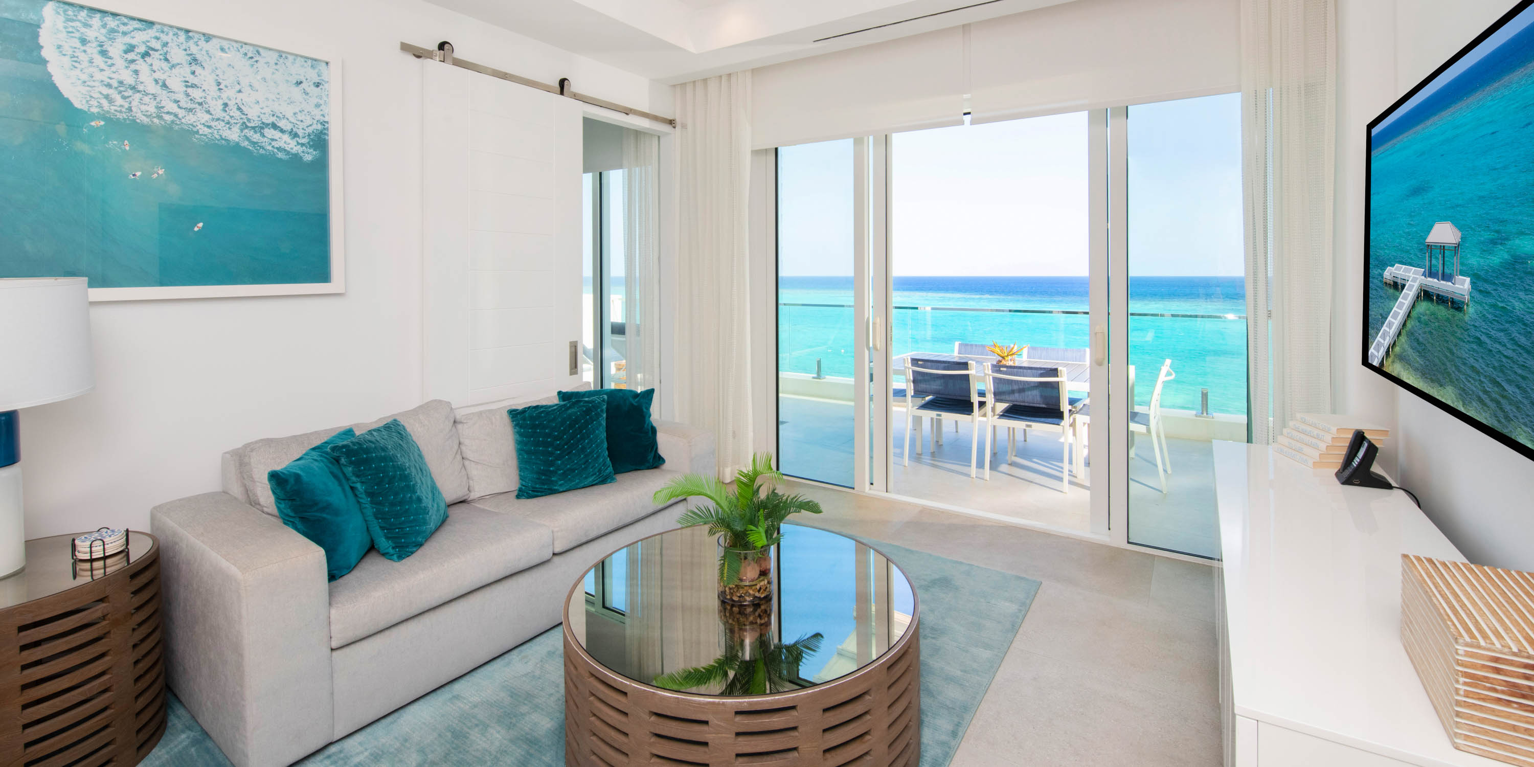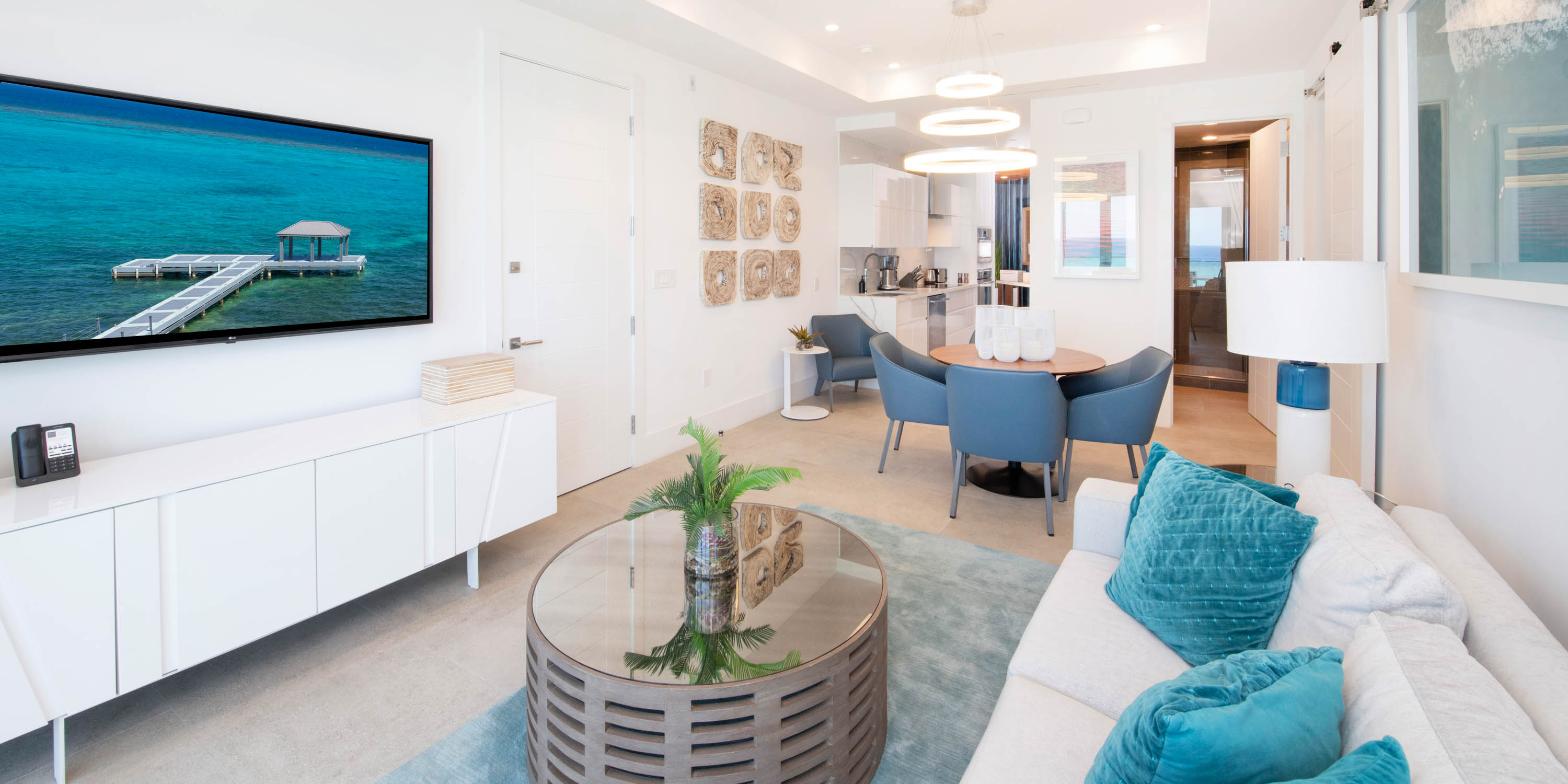 All Rum Point Resort condos feature sleek finishes, designer decor, and an open-concept layout maximizing space, natural light, and stunning ocean views. All the comforts of home are included in this 1-bedroom condo, including gourmet kitchen appliances, quartz countertops, SmartTVs for streaming, and a private oceanfront balcony.